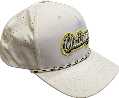 White rope style hat with a patch centered on the front of the hat. Patch is white, sewn on, featuring the Claiborne script logo.
